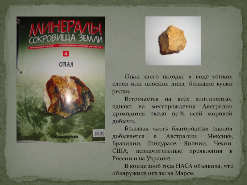Слайд 6Опал часто находят в виде тонких слоев или плоских линз, большие