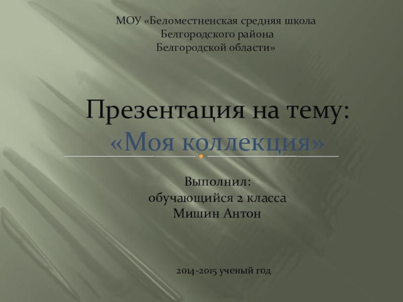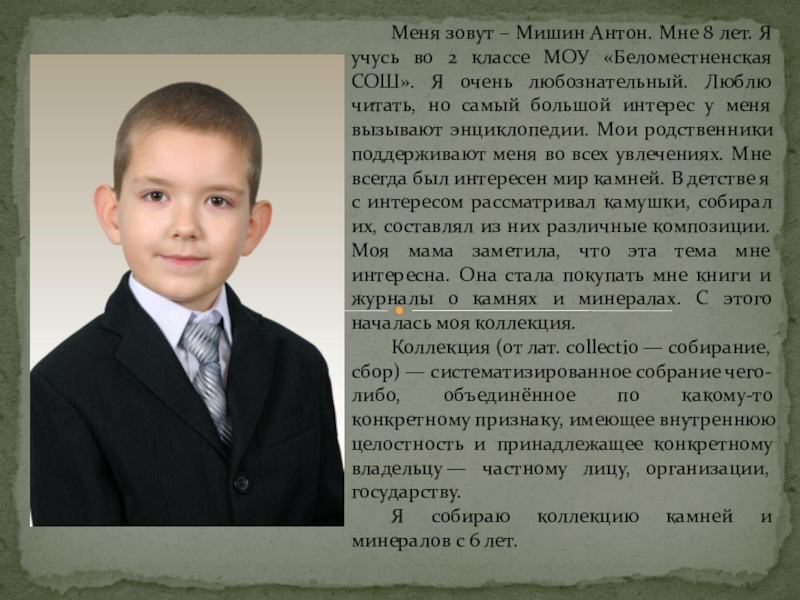 2 классе МОУ «Беломестненская СОШ». Я очень любознательный. Люблю читать, но самый большой интерес у меня вызывают энциклопедии. Мои родственники поддерживают меня во всех увлечениях. Мне всегда был интересен мир камней. В детстве я с интересом рассматривал камушки, собирал их, составлял из них различные композиции. Моя мама заметила, что эта тема мне интересна. Она стала покупать мне книги и журналы о камнях и минералах. С этого началась моя коллекция.
