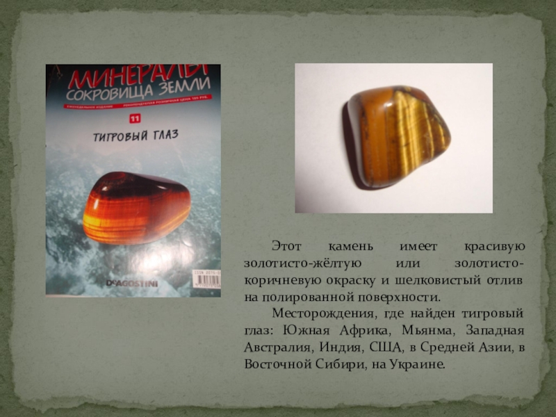 Слайд 12Этот камень имеет красивую золотисто-жёлтую или золотисто-коричневую окраску и шелковистый отлив