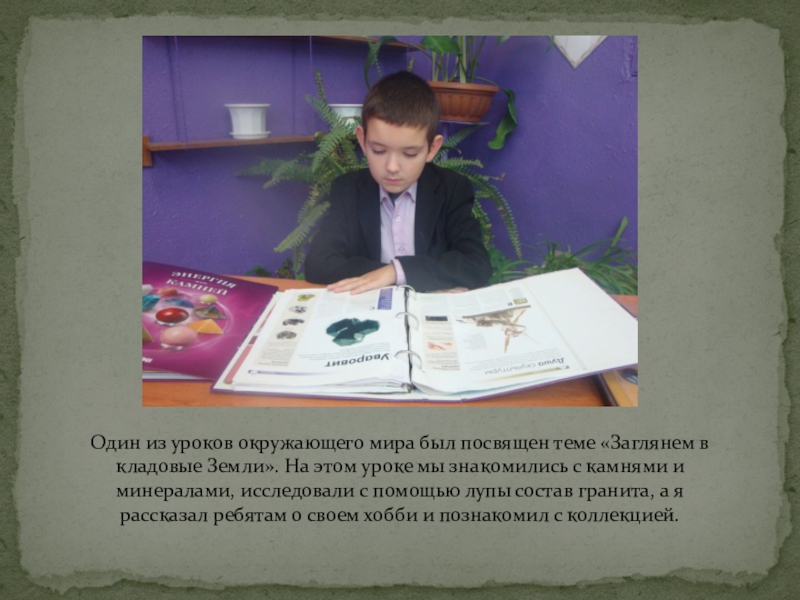 Земли». На этом уроке мы знакомились с камнями и минералами, исследовали с помощью лупы состав гранита, а я рассказал ребятам о своем хобби и познакомил с коллекцией.