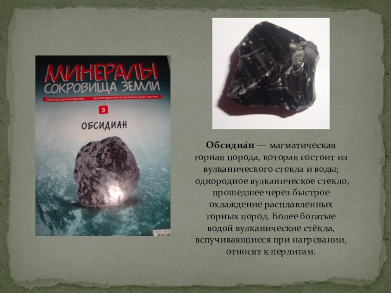 Слайд 5Обсидиа́н — магматическая горная порода, которая состоит из вулканического стекла и воды;
