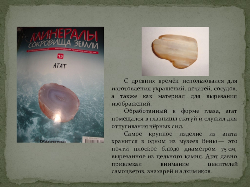 Самое крупное изделие из агата хранится в одном из музеев Вены — это почти плоское блюдо диаметром 75 см, вырезанное из цельного камня. Агат давно привлекал внимание ценителей самоцветов, знахарей и алхимиков.