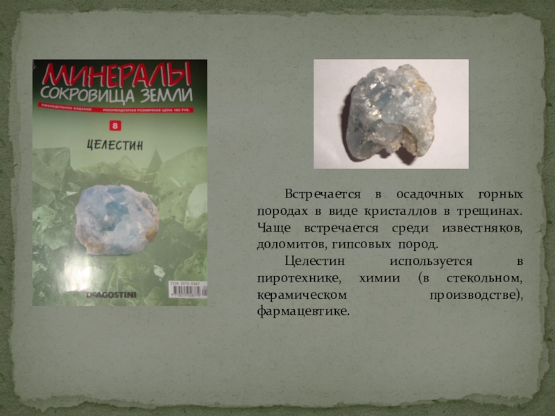 Слайд 9Встречается в осадочных горных породах в виде кристаллов в трещинах. Чаще
