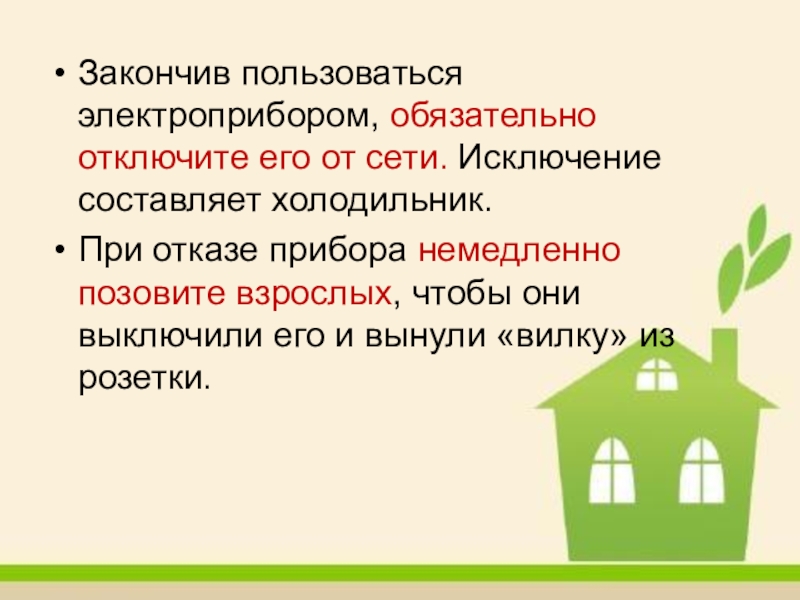Слайд 3Закончив пользоваться электроприбором, обязательно отключите его от сети. Исключение составляет холодильник.