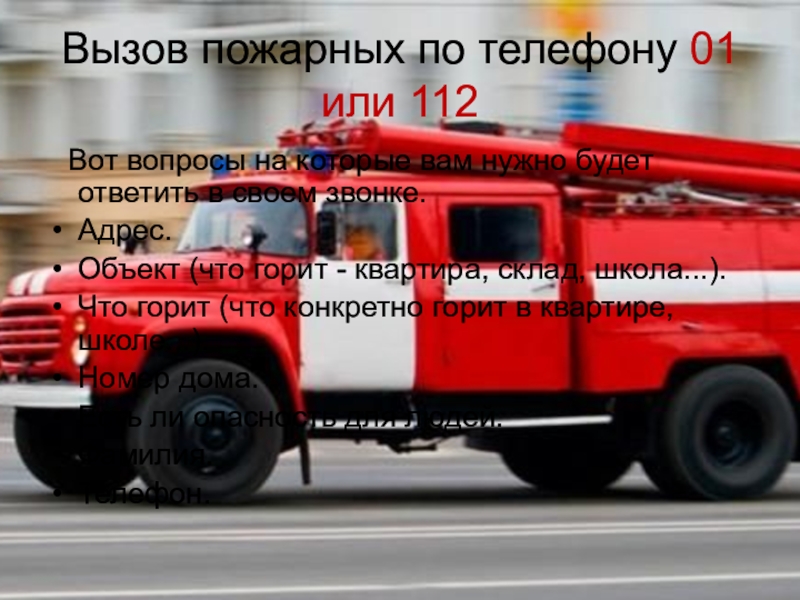 Слайд 7Вызов пожарных по телефону 01 или 112