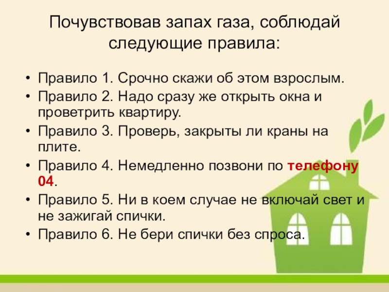 Слайд 6Почувствовав запах газа, соблюдай следующие правила: