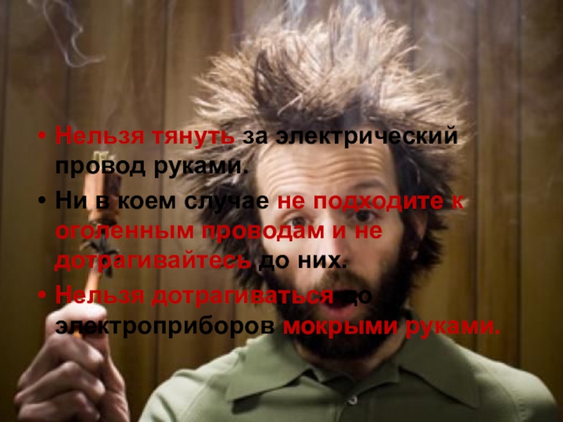 Слайд 4Нельзя тянуть за электрический провод руками.