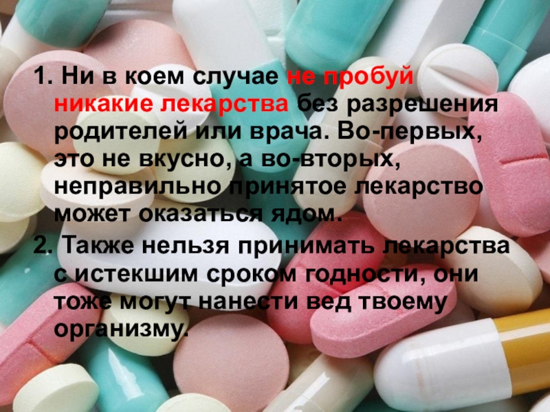 Слайд 121. Ни в коем случае не пробуй никакие лекарства без разрешения