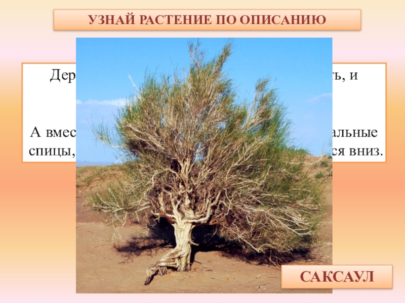 УЗНАЙ РАСТЕНИЕ ПО ОПИСАНИЮДерево пустыни – ствол крепкий, как кость, и тяжёлый, как камень. Сучья кручёные-перекручёные. А