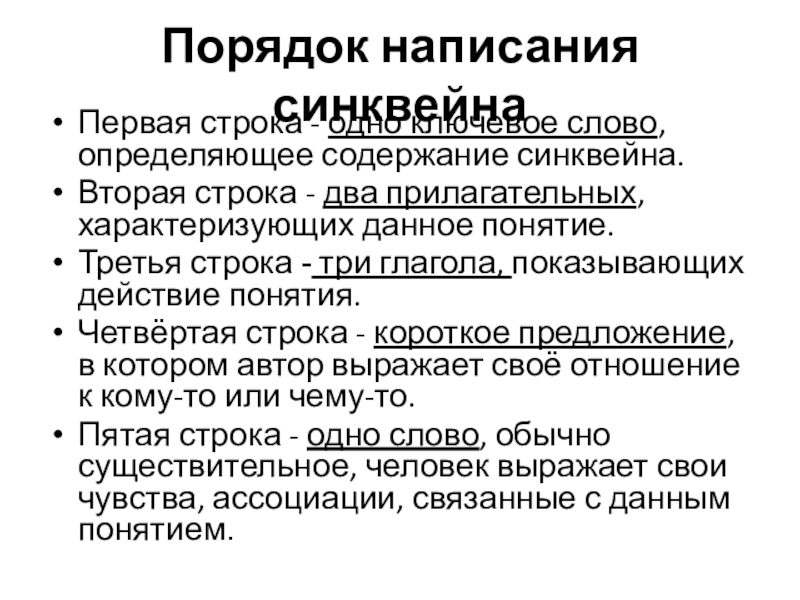 Пятая строка - одно слово, обычно существительное, человек выражает свои чувства, ассоциации, связанные с данным понятием.