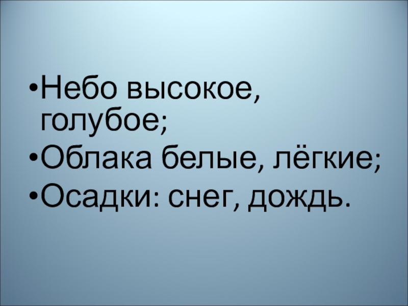 Небо высокое, голубое;Облака белые, лёгкие;Осадки: снег, дождь.