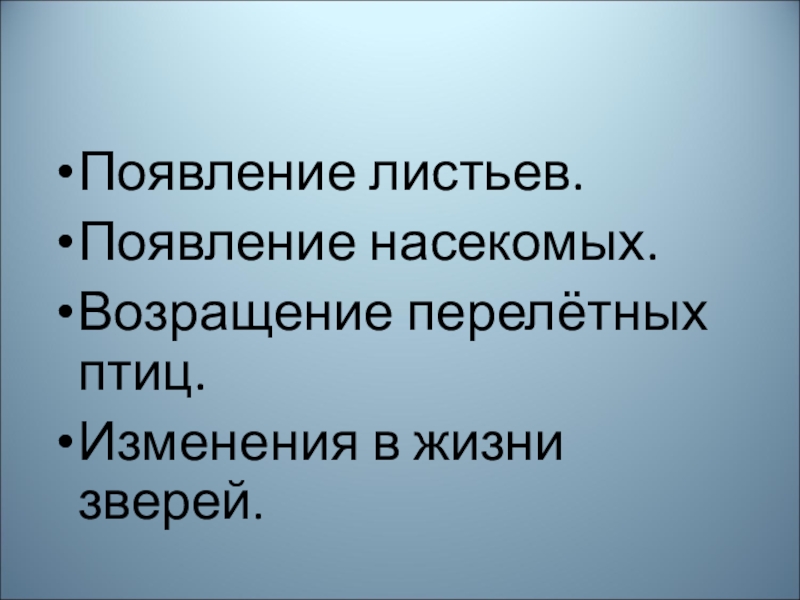 Появление листьев.Появление насекомых.Возращение перелётных птиц.Изменения в жизни зверей.