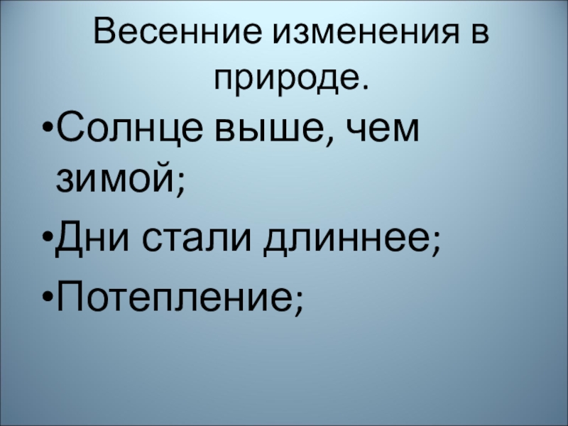 Весенние изменения в природе.Солнце выше, чем зимой;Дни стали длиннее;Потепление;