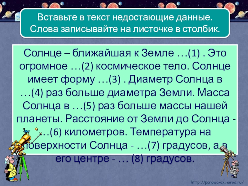 тело. Солнце имеет форму …(3) . Диаметр Солнца в …(4) раз больше диаметра Земли. Масса Солнца в …(5) раз больше массы нашей планеты. Расстояние от Земли до Солнца - …(6) километров. Температура на поверхности Солнца - …(7) градусов, а в его центре - … (8) градусов.