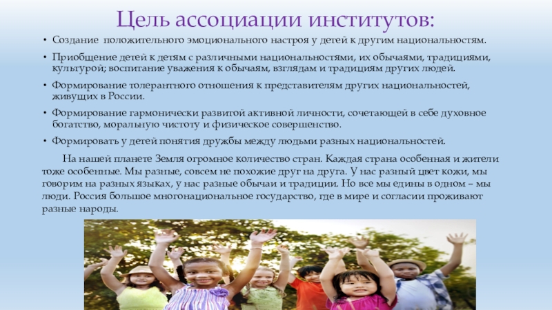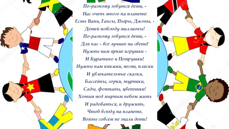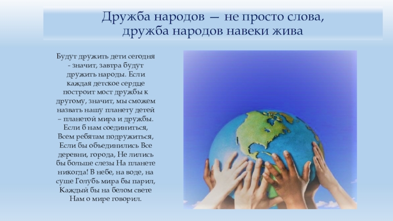 Будут дружить дети сегодня - значит, завтра будут дружить народы. Если каждая детское сердце построит мост дружбы к другому, значит, мы сможем назвать нашу планету детей – планетой мира и дружбы. Если б нам соединиться, Всем ребятам подружиться, Если бы объединились Все деревни, города, Не лились бы больше слезы На планете никогда! В небе, на воде, на суше Голубь мира бы парил, Каждый бы на белом свете Нам о мире говорил.