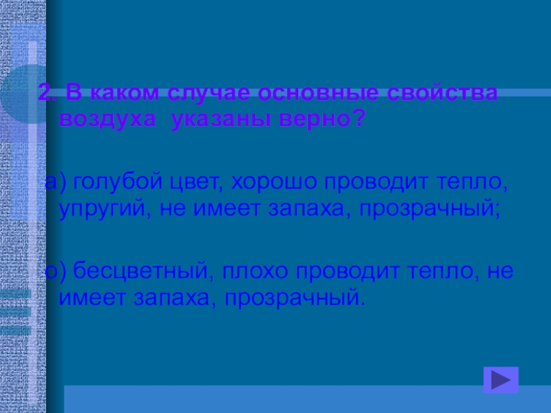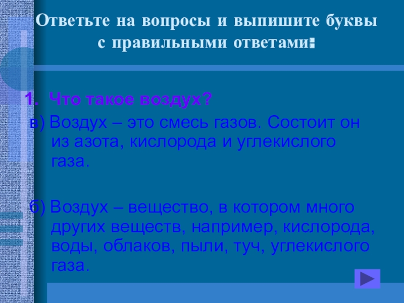 в) Воздух – это смесь газов. Состоит он из азота, кислорода и углекислого газа.