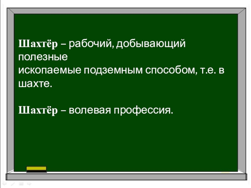 Шахтёр – рабочий, добывающий полезныеископаемые подземным способом, т.е. в шахте.Шахтёр – волевая профессия.