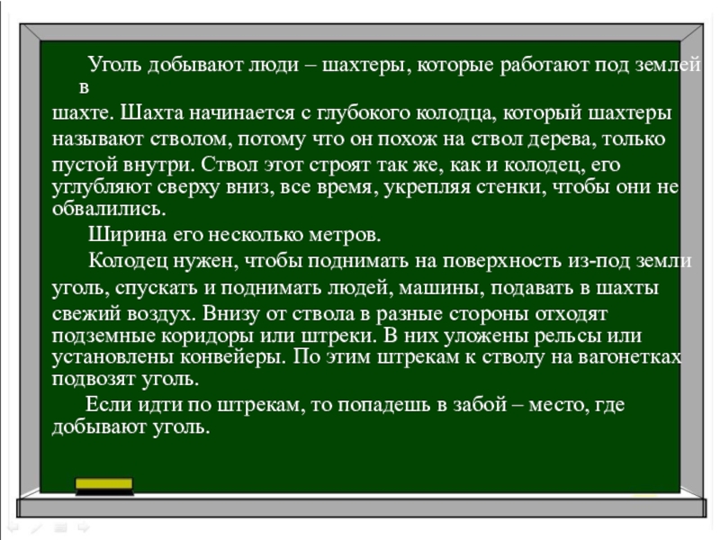 Уголь добывают люди – шахтеры, которые работают под землей вшахте. Шахта начинается с глубокого колодца, который шахтерыназывают