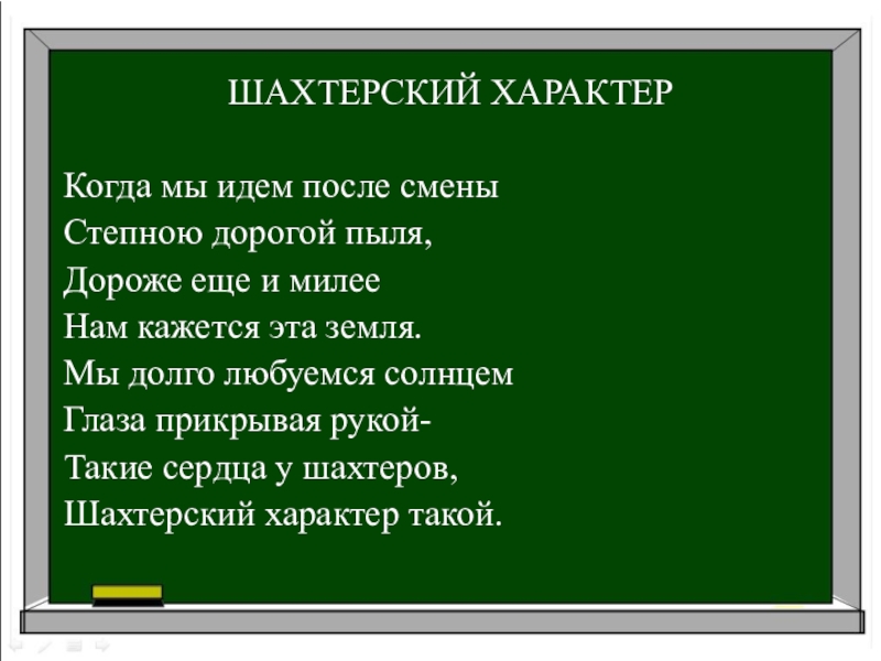 ШАХТЕРСКИЙ ХАРАКТЕРКогда мы идем после сменыСтепною дорогой пыля,Дороже еще и милееНам кажется эта земля.Мы долго любуемся солнцемГлаза