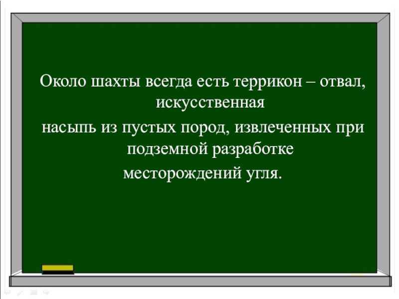 Около шахты всегда есть террикон – отвал, искусственнаянасыпь из пустых пород, извлеченных при подземной разработкеместорождений угля.