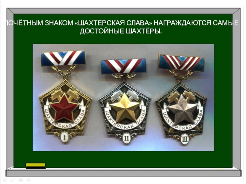 Слайд 21Почётным знаком «Шахтерская слава» награждаются самые достойные шахтёры.