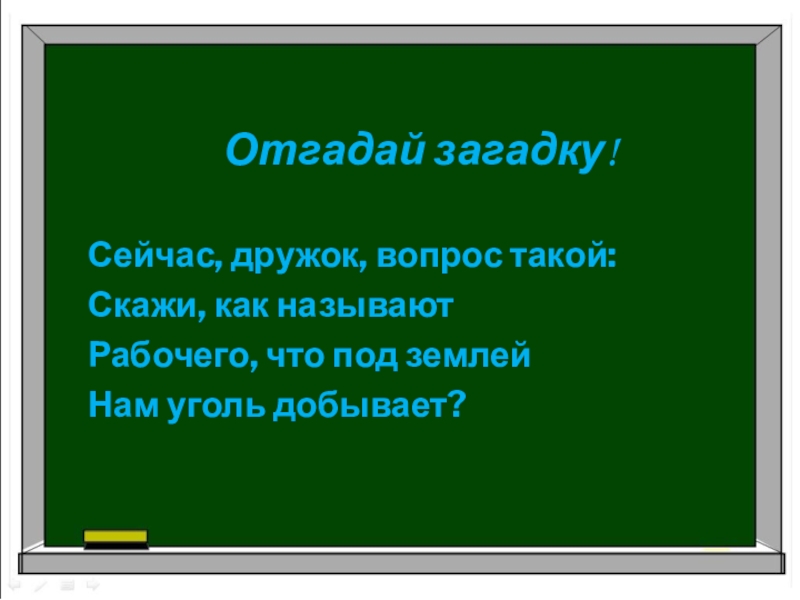 Отгадай загадку!	Сейчас, дружок, вопрос такой:	Скажи, как называют	Рабочего, что под землей	Нам уголь добывает?