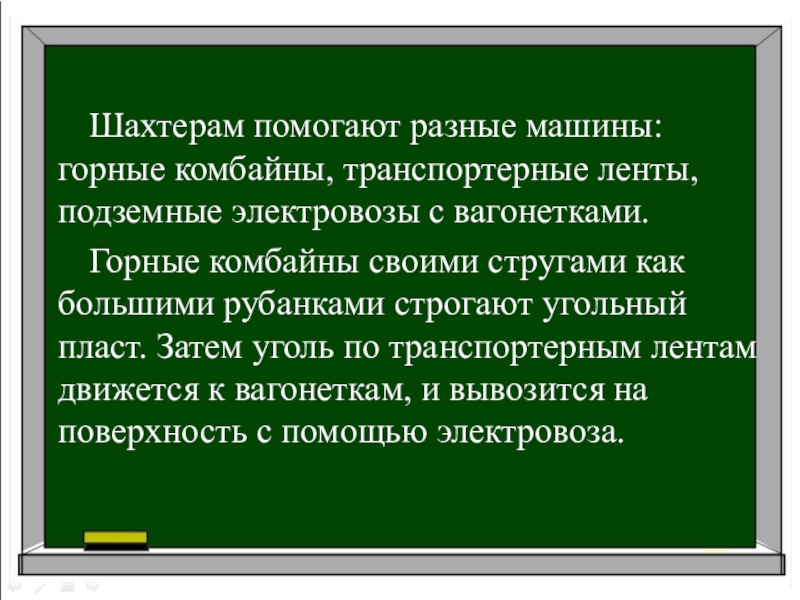 Шахтерам помогают разные машины: горные комбайны, транспортерные ленты, подземные электровозы с вагонетками.Горные комбайны своими стругами как большими