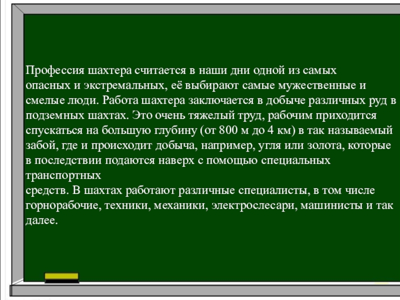 Слайд 11Профессия шахтера считается в наши дни одной из самых опасных и экстремальных,