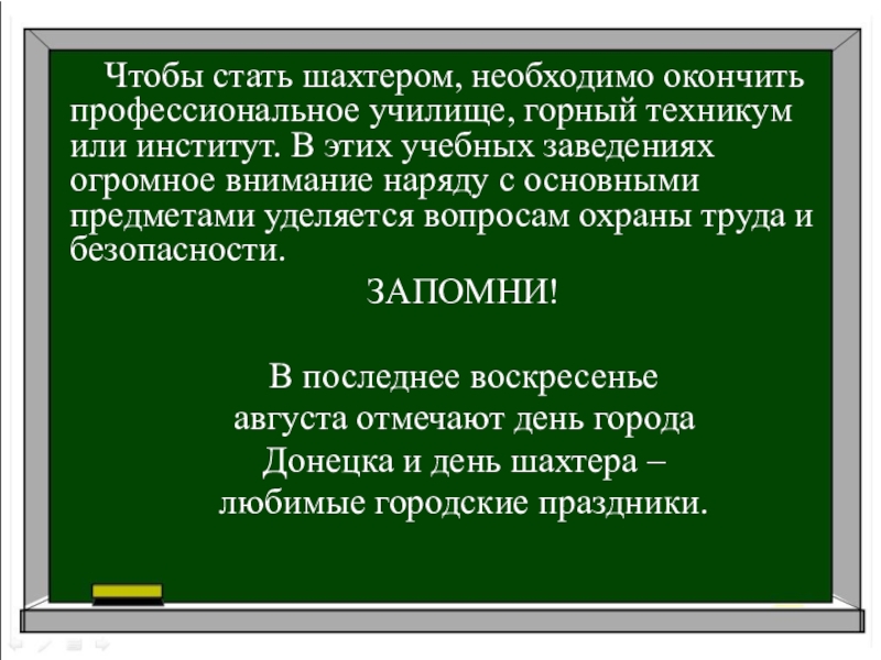 Слайд 25Чтобы стать шахтером, необходимо окончить профессиональное училище, горный техникум или институт.