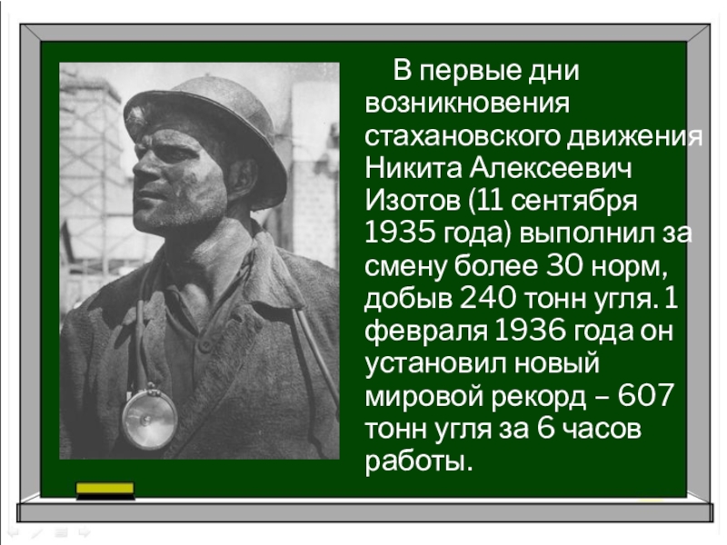 В первые дни возникновения стахановского движения Никита Алексеевич Изотов (11 сентября 1935 года) выполнил за смену более