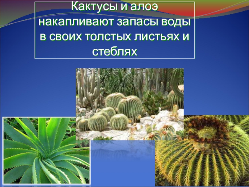 Кактусы и алоэ накапливают запасы воды в своих толстых листьях и стеблях