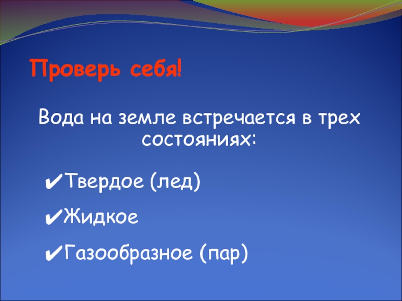 Вода на земле встречается в трех состояниях: Проверь себя!  Твердое (лед)ЖидкоеГазообразное (пар)