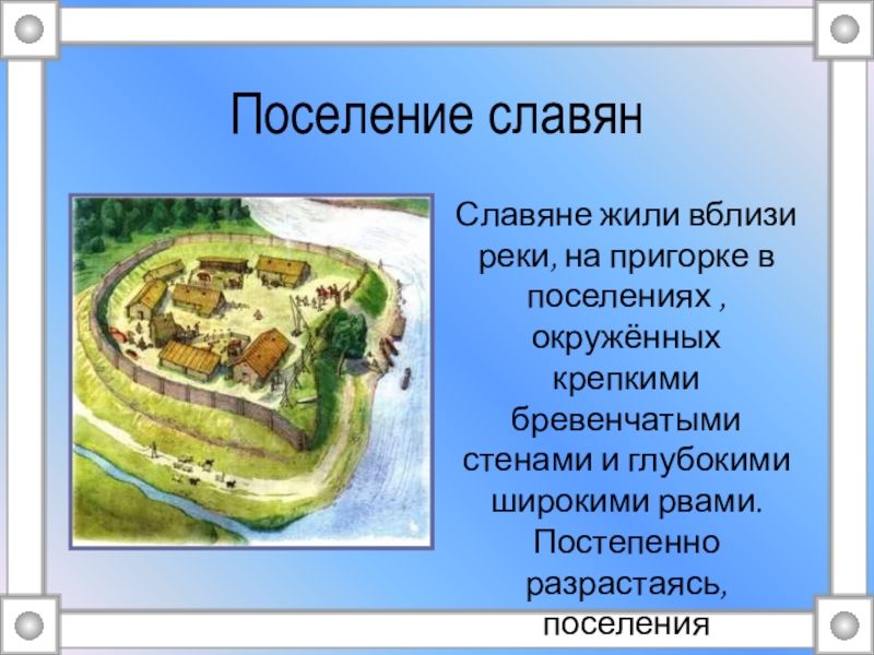 Поселение славянСлавяне жили вблизи реки, на пригорке в поселениях , окружённых  крепкими бревенчатыми стенами и глубокими