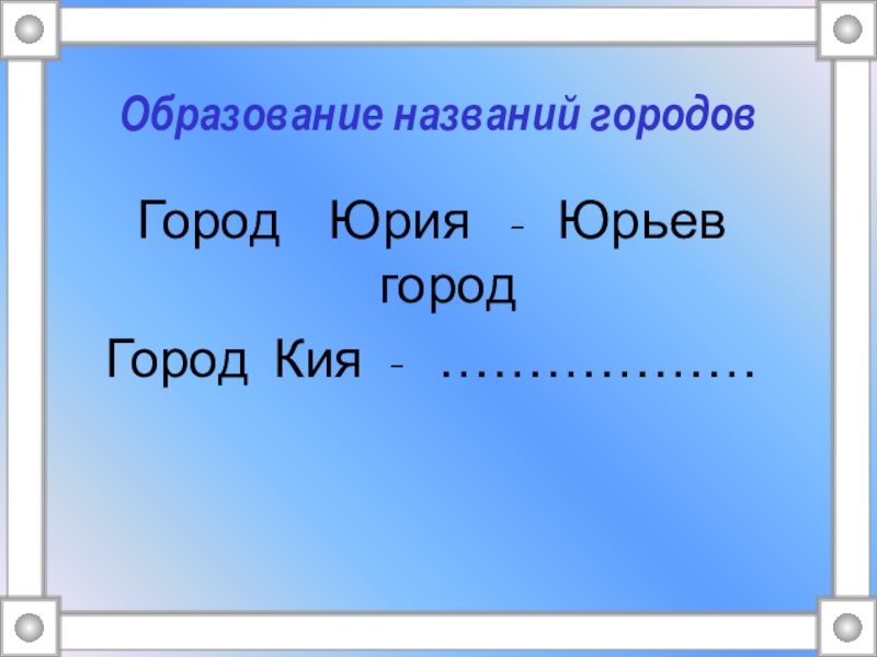 Образование названий городовГород  Юрия  -  Юрьев городГород Кия -  ………………