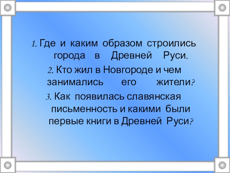 1. Где и каким образом строились города  в   Древней   Руси. 2. Кто