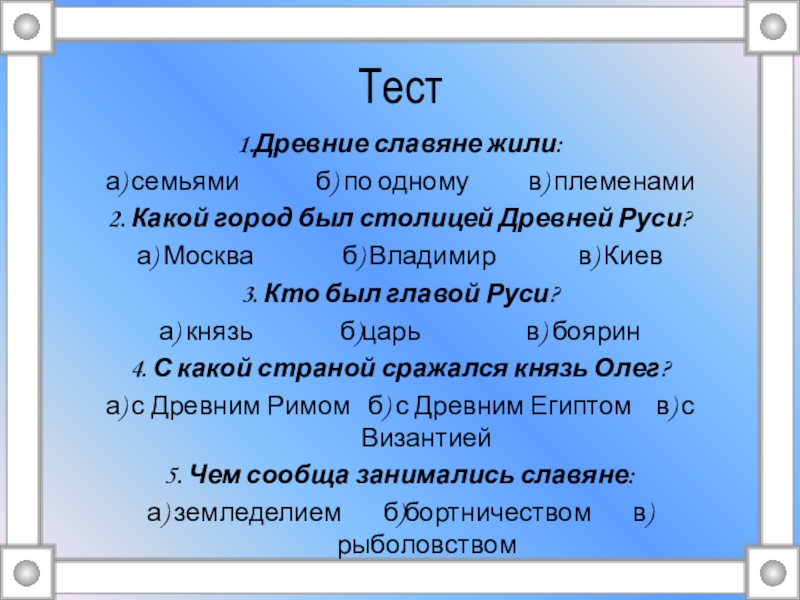 Тест1.Древние славяне жили:а) семьями       б) по одному