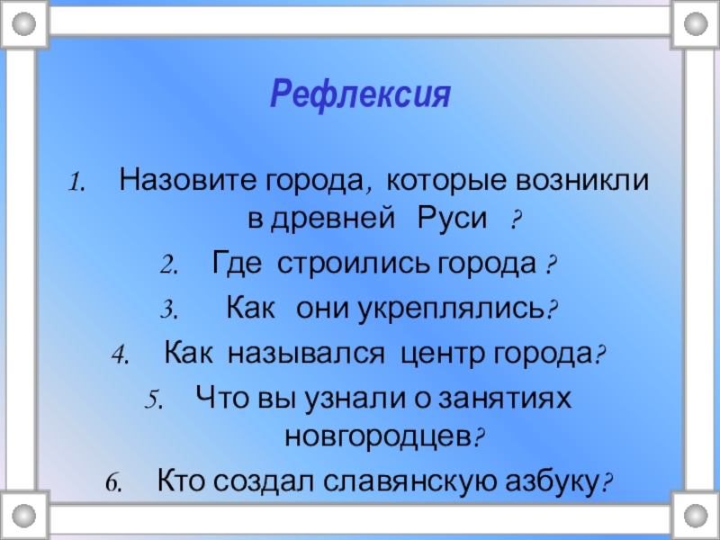 РефлексияНазовите города, которые возникли в древней  Руси  ?Где строились города ? Как  они укреплялись?Как
