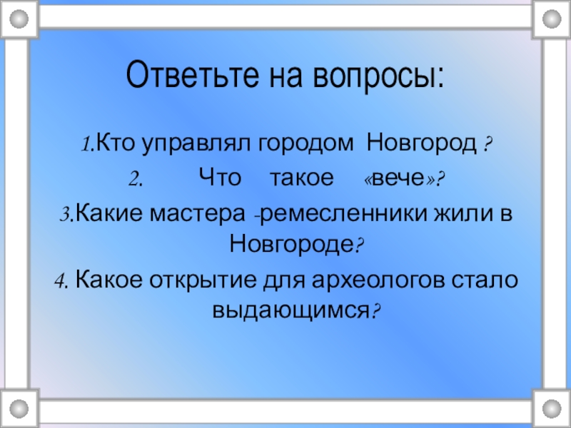 Ответьте на вопросы:1.Кто управлял городом Новгород ?2.     Что   такое