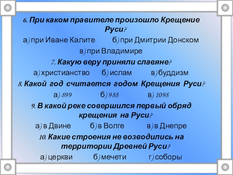 6. При каком правителе произошло Крещение Руси?а) при Иване Калите     б) при Дмитрии