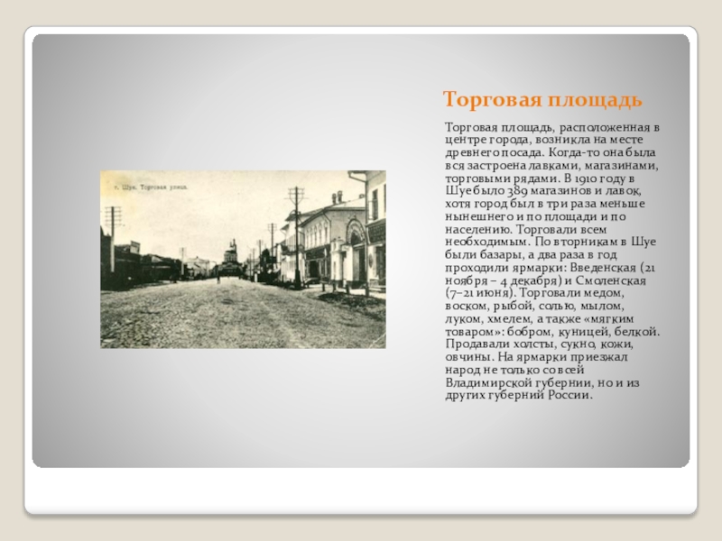 посада. Когда-то она была вся застроена лавками, магазинами, торговыми рядами. В 1910 году в Шуе было 389 магазинов и лавок, хотя город был в три раза меньше нынешнего и по площади и по населению. Торговали всем необходимым. По вторникам в Шуе были базары, а два раза в год проходили ярмарки: Введенская (21 ноября – 4 декабря) и Смоленская (7–21 июня). Торговали медом, воском, рыбой, солью, мылом, луком, хмелем, а также «мягким товаром»: бобром, куницей, белкой. Продавали холсты, сукно, кожи, овчины. На ярмарки приезжал народ не только со всей Владимирской губернии, но и из других губерний России.