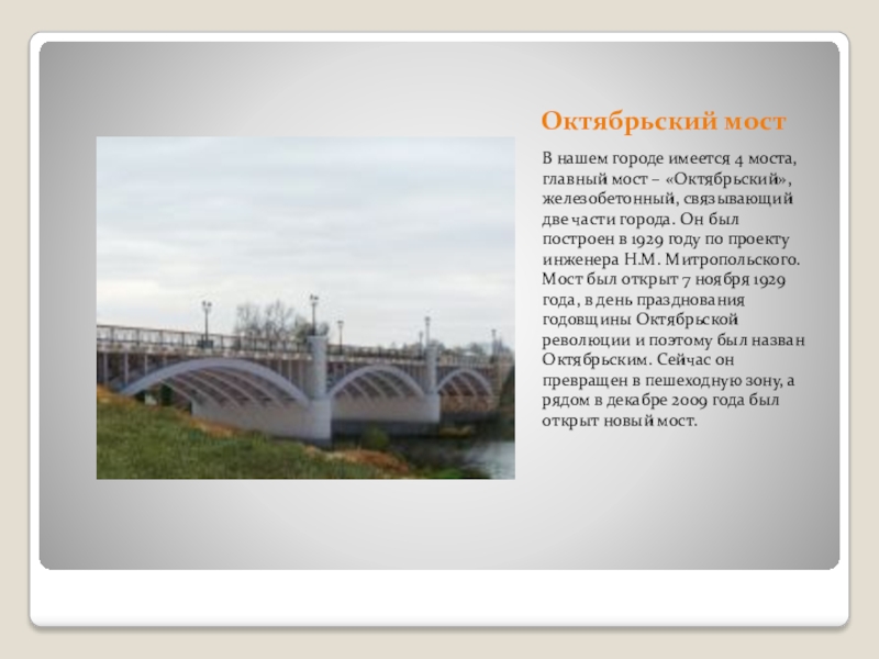 железобетонный, связывающий две части города. Он был построен в 1929 году по проекту инженера Н.М. Митропольского. Мост был открыт 7 ноября 1929 года, в день празднования годовщины Октябрьской революции и поэтому был назван Октябрьским. Сейчас он превращен в пешеходную зону, а рядом в декабре 2009 года был открыт новый мост.