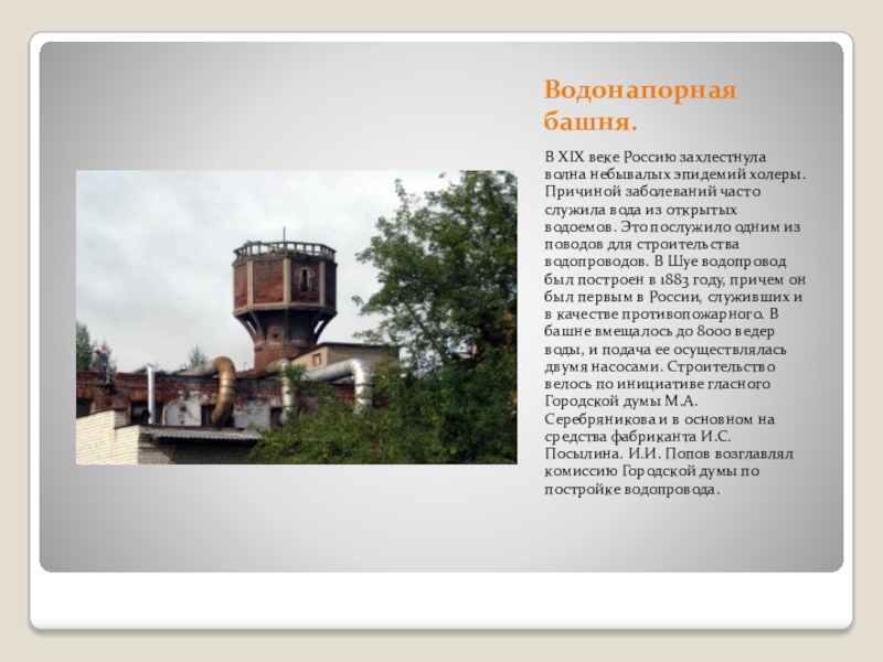заболеваний часто служила вода из открытых водоемов. Это послужило одним из поводов для строительства водопроводов. В Шуе водопровод был построен в 1883 году, причем он был первым в России, служивших и в качестве противопожарного. В башне вмещалось до 8000 ведер воды, и подача ее осуществлялась двумя насосами. Строительство велось по инициативе гласного Городской думы М.А. Серебряникова и в основном на средства фабриканта И.С. Посылина. И.И. Попов возглавлял комиссию Городской думы по постройке водопровода.