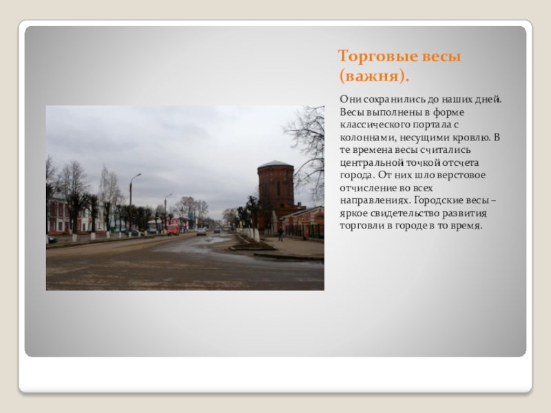 классического портала с колоннами, несущими кровлю. В те времена весы считались центральной точкой отсчета города. От них шло верстовое отчисление во всех направлениях. Городские весы – яркое свидетельство развития торговли в городе в то время.