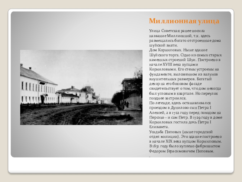 Улица Советская ранее носила название Миллионной, т.к. здесь размещались богато