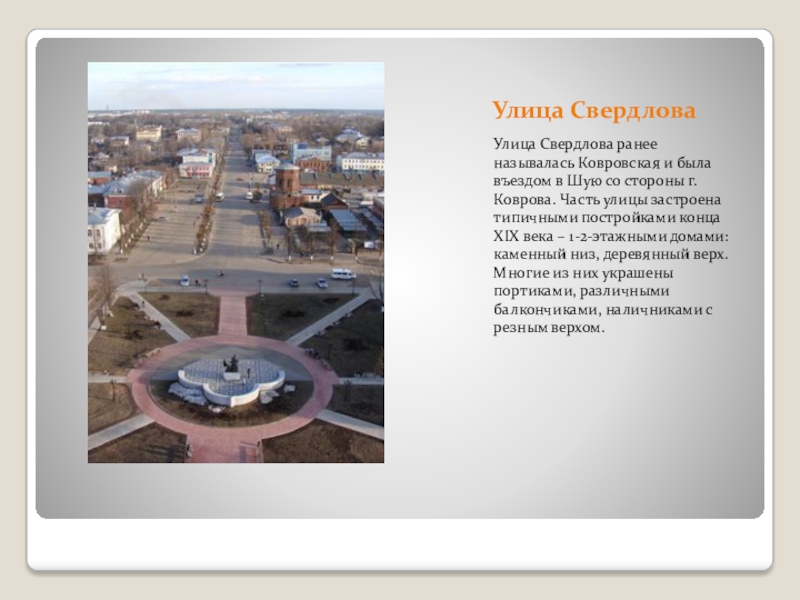 со стороны г. Коврова. Часть улицы застроена типичными постройками конца XIX века – 1-2-этажными домами: каменный низ, деревянный верх. Многие из них украшены портиками, различными балкончиками, наличниками с резным верхом.