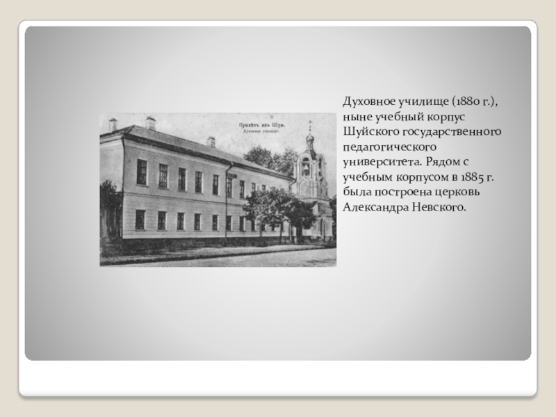 Слайд 13Духовное училище (1880 г.), ныне учебный корпус Шуйского государственного педагогического университета.