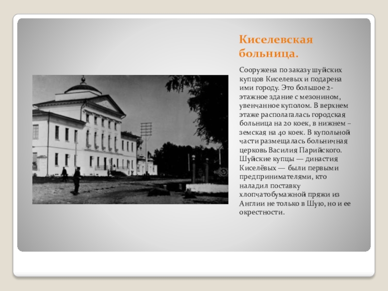 Шуйские купцы — династия Киселёвых — были первыми предпринимателями, кто наладил поставку хлопчатобумажной пряжи из Англии не только в Шую, но и ее окрестности.