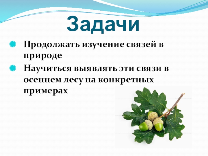Задачи Продолжать изучение связей в природеНаучиться выявлять эти связи в осеннем лесу на конкретных примерах