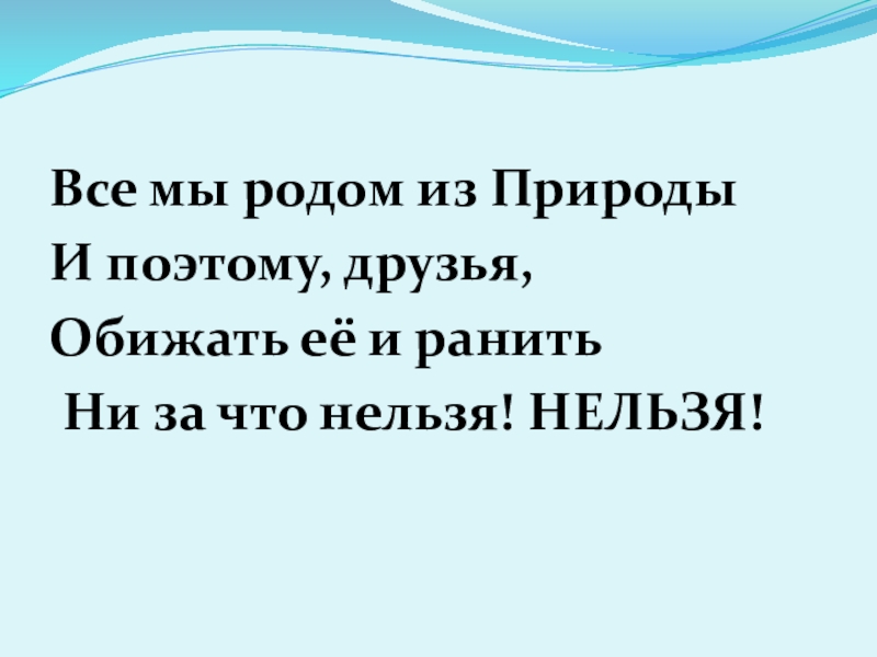 Все мы родом из ПриродыИ поэтому, друзья,Обижать её и ранить Ни за что нельзя! НЕЛЬЗЯ!