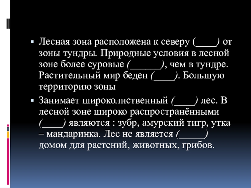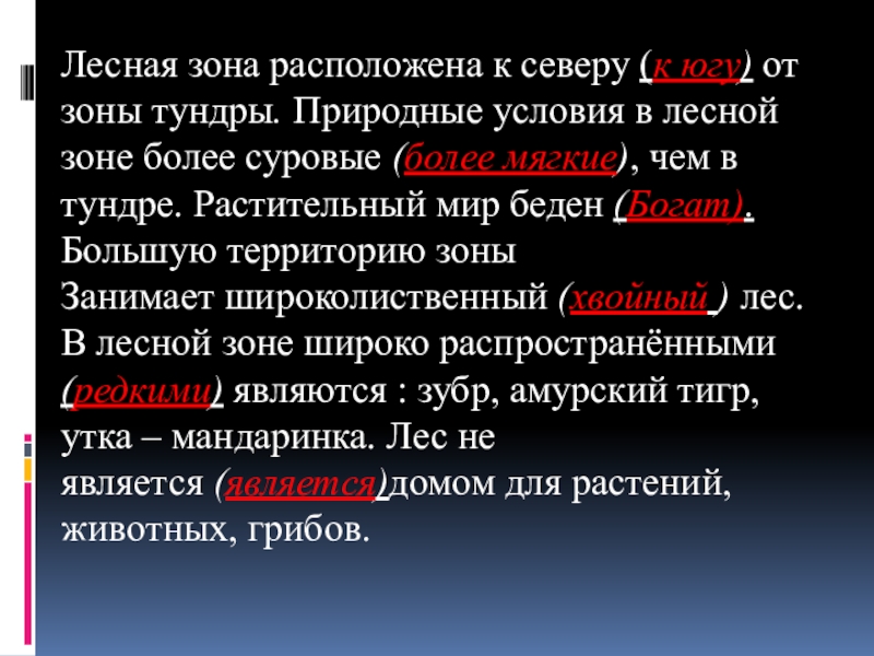 Занимает широколиственный (____) лес. В лесной зоне широко распространёнными(____) являются : зубр, амурский тигр, утка – мандаринка. Лес не является (_____)домом для растений, животных, грибов.